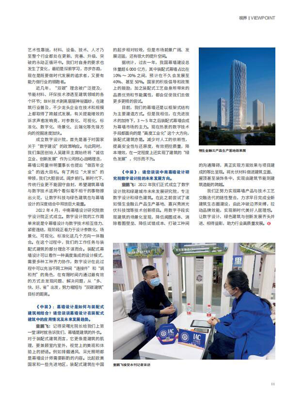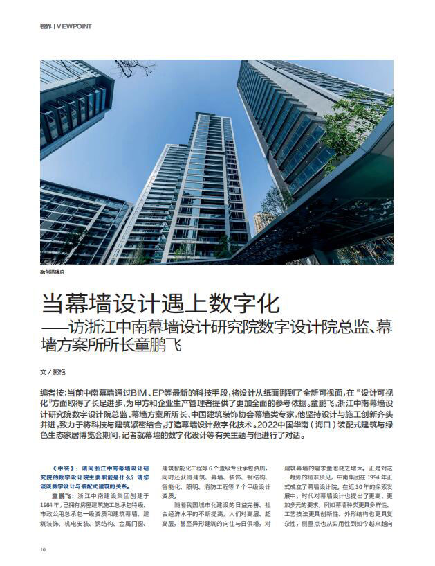 当前中南幕墙通过BIM、EP等最新的科技手段,将设计从纸面挪到了全新可视面,在“设计可视化”方面取得了长足进步,为甲方和企业生产管理者提供了更加全面的参考依据。童鹏飞,浙江中南幕墙设计研究院数字设计院总监、幕墙方案所所长、中国建筑装饰协会幕墙类专家,他坚持设计与施工创新齐头并进,致力于将科技与建筑紧密结合,打造幕墙设计数字化技术。2022中国华南(海口)装配式建筑与绿色生态家居博览会期间,记者就幕墙的数字化设计等有关主题与他进行了对话。