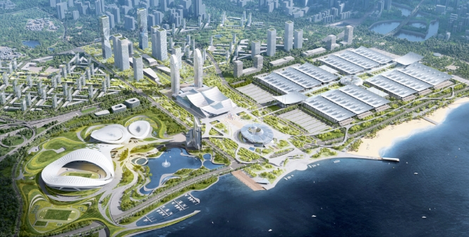 ▲ 国际竞赛阶段效果图:城市设计沿海鸟瞰视角