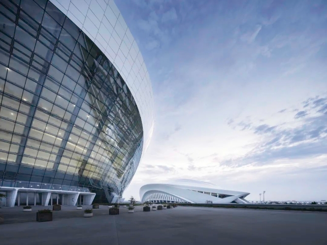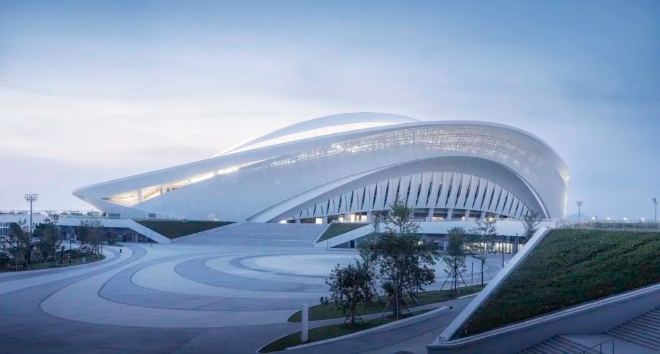 马鞍形曲线巨拱结构与面海打开的白鹭体育场形态