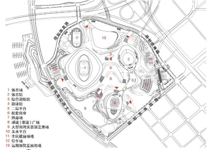 在国际竞赛中标后长达一年的方案调整中,我们首先在城市设计层面,进一步将用地周边既有的历史古镇、工业遗产建筑及客运码头等纳入设计与更新范围,形成渔人码头、艺术文创、游艇码头与环湾商业等多元业态融合的城市公共空间,并在总体布局层面将一场两馆调整为环湾向心、圈层式的集约布局:即围绕6万座白鹭体育场为中心,1.8万座凤凰体育馆、2千座训练馆及5千座白海豚游泳馆环湾面海,围绕中心球(歌)迷广场线性展开的环湾向心的现在这个布局模式。