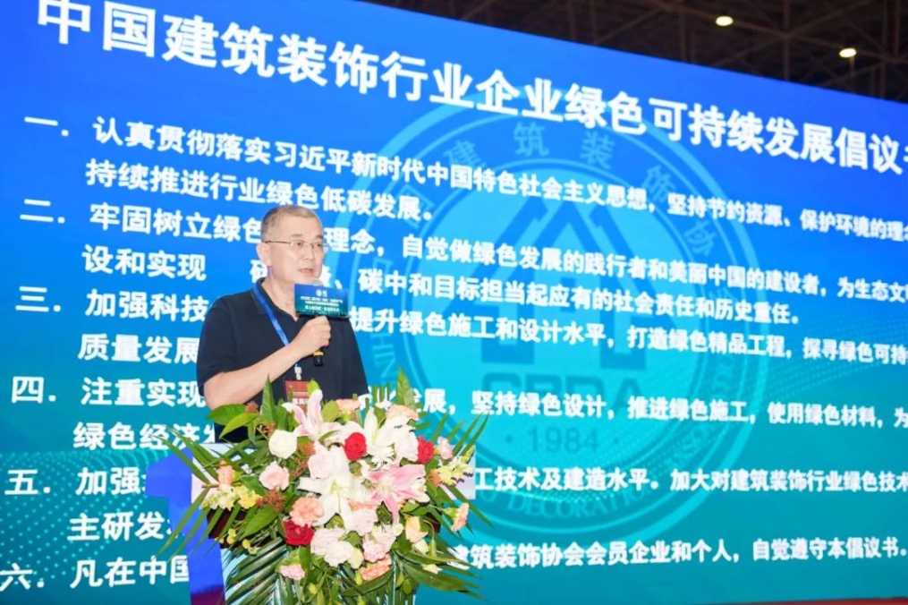 中国建筑装饰协会副会长兼副秘书长单波主持并宣读了《中国建筑装饰行业企业绿色可持续发展倡议》:中国建筑装饰行业企业坚决贯彻党中央的绿色发展理念,落实党和国家对低碳节能环保和绿色发展工作的要求和部署,引导行业和企业自觉走向绿色生态发展之路。北京三鑫晶品装饰工程有限公司总经理陈亮代表参与企业发言。