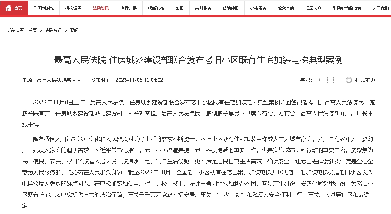 近年来,最高人民法院与住房城乡建设部在多个领域通力协作,通过共同建立“总对总”在线诉调对接机制、发出和办理司法建议等方式共促多元解纷,形成法治合力。“一个案例胜过一打文件。”司法和执法案例是最生动的法治教材。为深入学习贯彻习近平总书记关于老旧小区改造的重要讲话精神、贯彻落实全国调解工作会议精神、促进无障碍环境建设法有效实施,推动多元解纷、促进诉源治理,在司法审判和行政执法中大力弘扬法治、文明、和谐、友善等社会主义核心价值观,让广大人民群众住有所居、居有所安,今天,最高人民法院与住房城乡建设部联合发布老旧小区加装电梯典型案例。