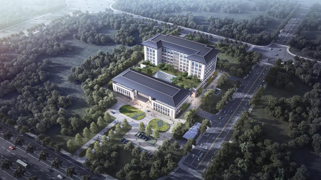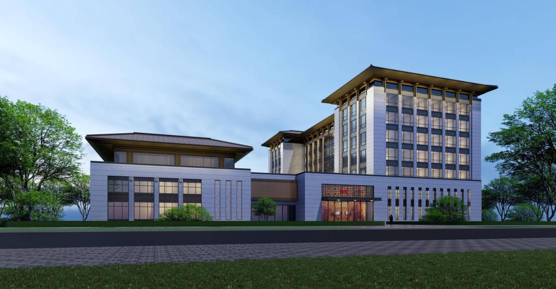 设计遵循“功能实用、美观大方、经济合理、绿色低碳”的原则,充分体现海绵城市、绿色建筑和公共节能等理念。建筑造型和室内空间、园林设计采用新中式建筑语言,与中医院的医院定位想匹配,用现代建筑语言抒写传统中式空间神韵。