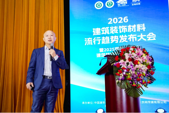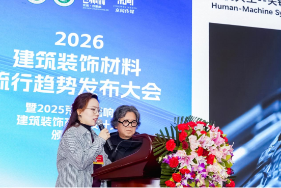 特邀嘉宾林学明、凌敬淇联袂发布了《立身世界——2026建筑装饰材料流行趋势报告》。从去年的“寻路”到今年的“立身”,两位嘉宾在走访了170余家企业,做了大量详实调研的基础上总结出了新的感悟和答案。报告从全球视野出发,结合中国文化内核与当代生活方式演变,预测了未来一年建筑装饰材料的色彩、质感、形态及技术应用走向。报告从“智能建造与数字融合”“存量更新与城市换新”“装配式于模块化内装”“产业融合与生态重构”等8个维度解析了中国建筑装饰行业发展的现状及特征,并对2026中国建筑装饰流行趋势进行解读与预测。他们指出,材料将更加注重与环境的和谐对话,体现科技赋能下的艺术表达,关注空间使用者的心理健康,并贯穿可循环、可再生的可持续理念。
