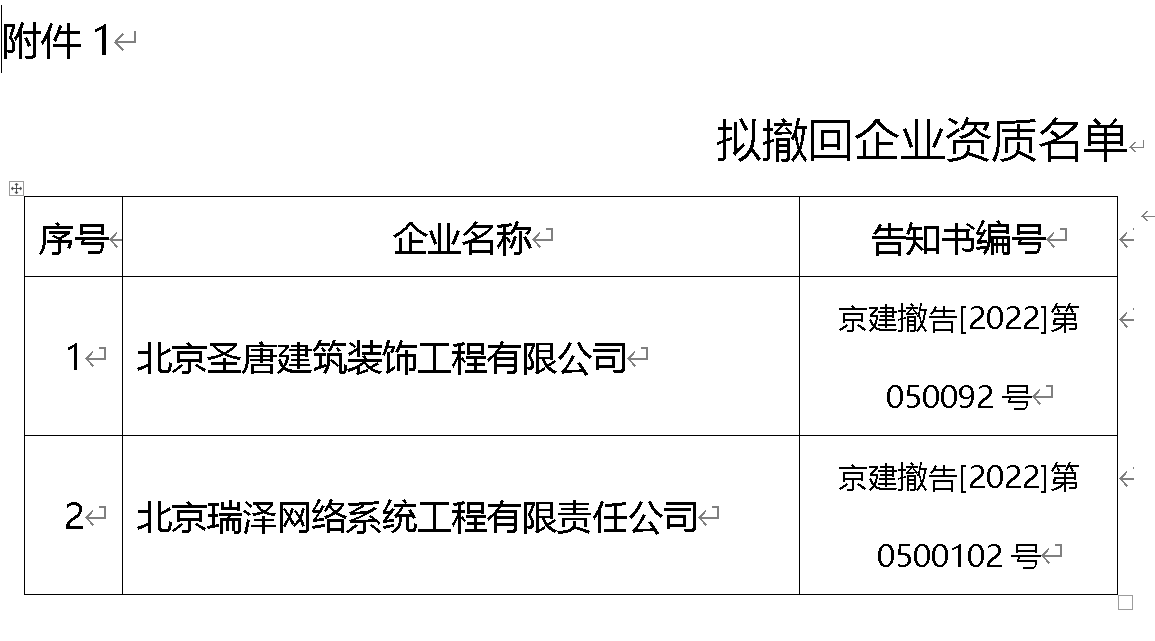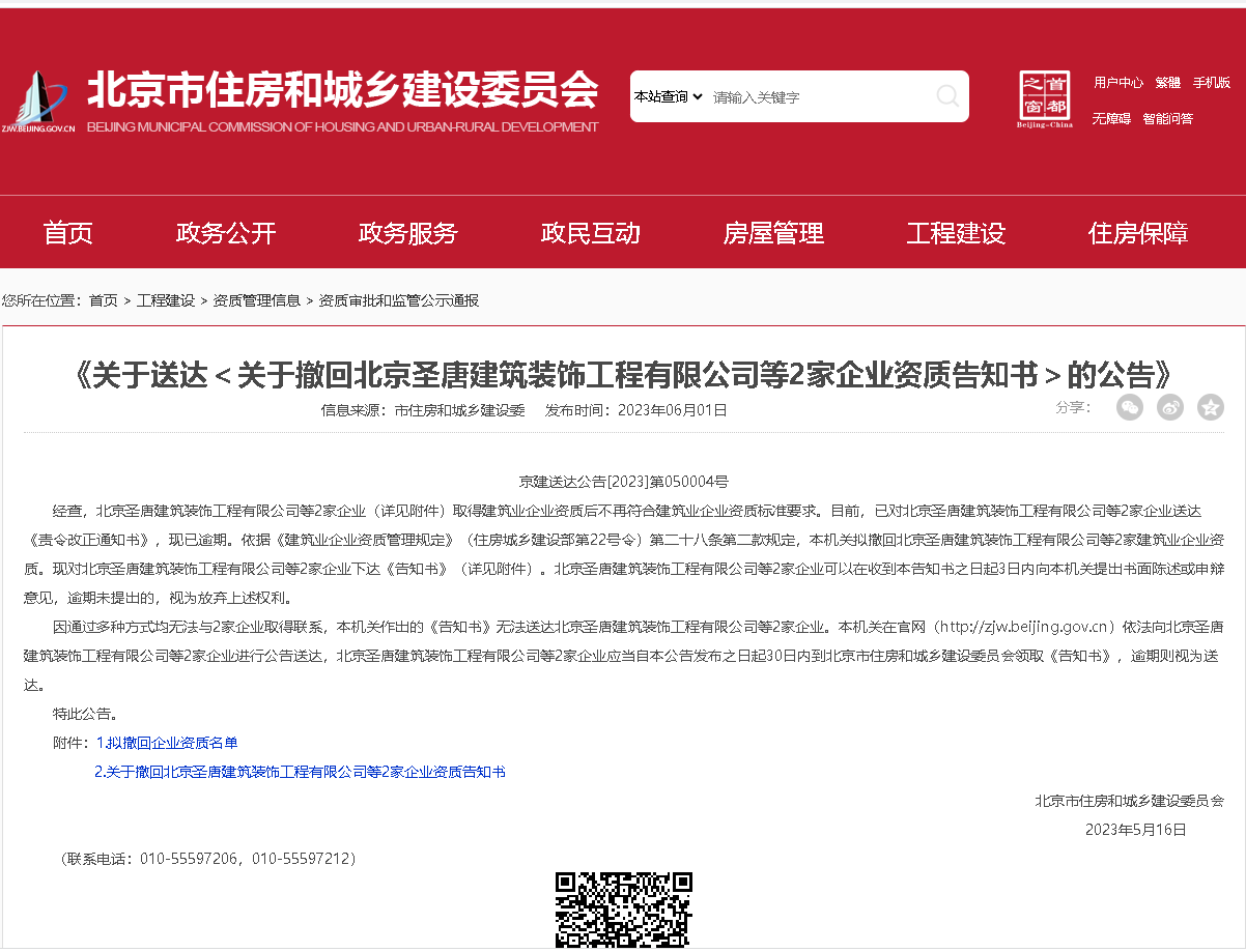 近日,北京市住房和城乡建设委,发布了《关于送达<关于撤回北京圣唐建筑装饰工程有限公司等2家企业资质告知书>的公告》,其主要内容如下: