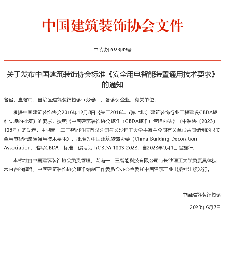 根据中国建筑装饰协会2016年12月8日《关于2016年(第七批)建筑装饰行业工程建设CBDA标准立项的批复》的要求,按照《中国建筑装饰协会标准(CBDA标准)管理办法》(中装协〔2023〕108号)的规定,由湖南一二三智能科技有限公司与长沙理工大学主编并会同有关单位共同编制的《安全用电智能装置通用技术要求》,批准为中国建筑装饰协会(China Building Decoration Association,缩写CBDA)标准,编号为T/CBDA 1003-2023,自2023年9月1日起施行。
