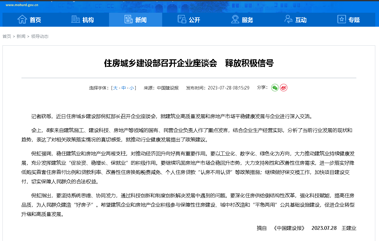 据住建部官网新闻,近日住房城乡建设部倪虹部长召开企业座谈会,就建筑业高质量发展和房地产市场平稳健康发展与企业进行深入交流。