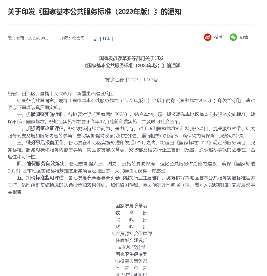 据悉,近日,国家发展改革委、教育部、住房城乡建设部等10部门联合印发《国家基本公共服务标准(2023年版)》。国家基本公共服务标准2021年首次发布实施。