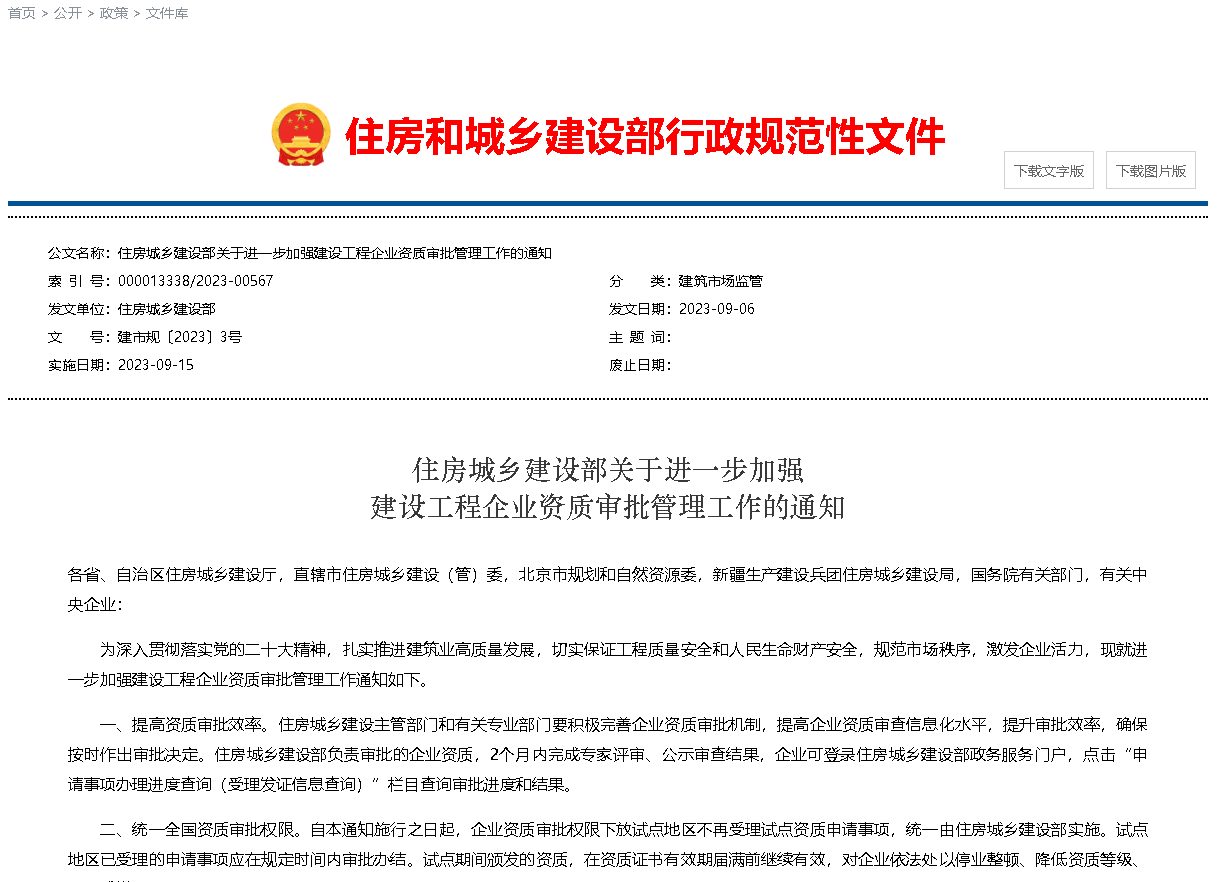 据悉,为深入贯彻落实党的二十大精神,扎实推进建筑业高质量发展,切实保证工程质量安全和人民生命财产安全,规范市场秩序,激发企业活力,住房城乡建设部近日发布《住房城乡建设部关于进一步加强建设工程企业资质审批管理工作的通知》(以下简称《通知》),要求进一步加强建设工程企业资质审批管理工作。《通知》内容涉及提高资质审批效率、统一全国资质审批权限、加强企业重组分立及合并资质核定、完善业绩认定方式、加大企业资质动态核查力度、强化建筑业企业资质注册人员考核要求、加强信用管理、建立函询制度、强化平台数据监管责任、加强党风廉政建设这10个方面。
