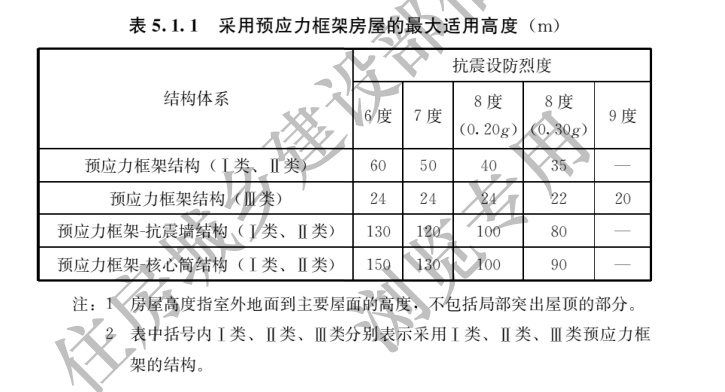 1 I类、Ⅱ类预应力框架可用于抗震设防烈度为8度及8度以下地区的框架结构、框架-抗震墙结构和框架-核心筒结构