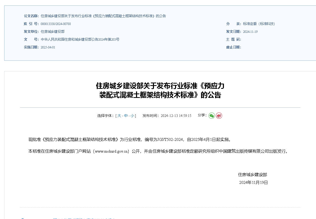 近日,住房城乡建设部关于发布行业标准《预应力装配式混凝土框架结构技术标准》的公告,现批准《预应力装配式混凝土框架结构技术标准》为行业标准,编号为JGJ/T502-2024,自2025年4月1日起实施。